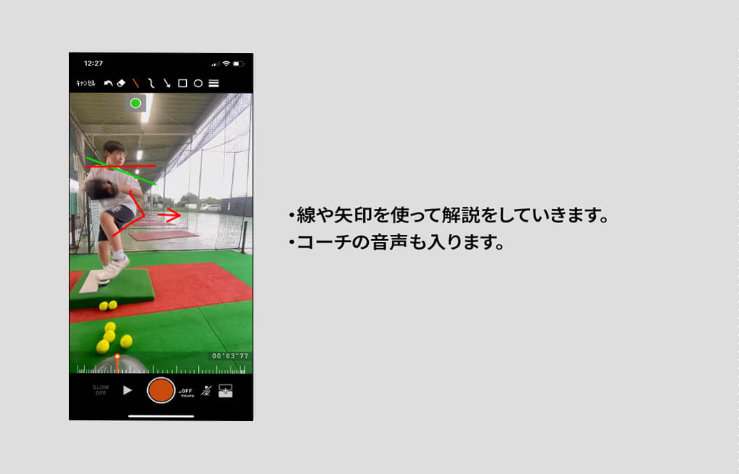 スマートフォンやタブレットで選手のピッチングフォームを撮影していただき専用アプリから送信するだけで、その動画をもとにコーチがわかりやすくレッスン・アドバイスをいたします。